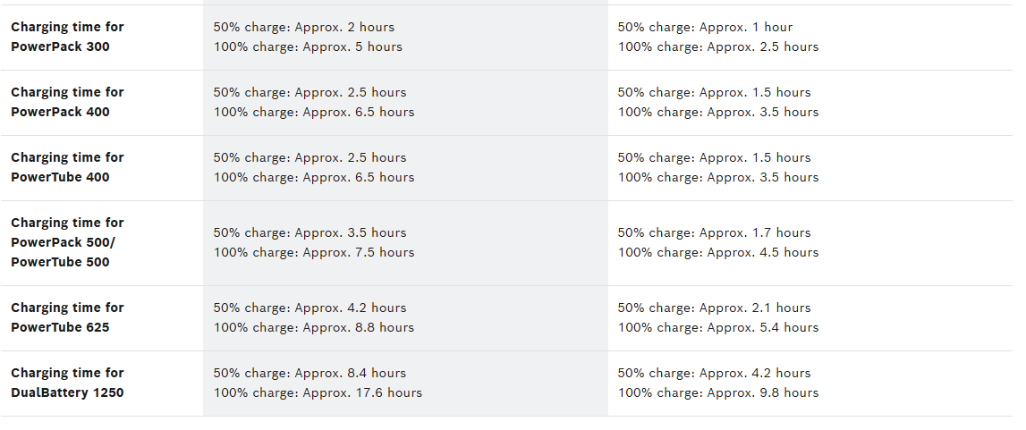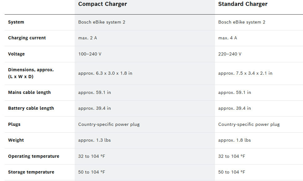 Replacement ebike chargers for Bosch System 2 (not Smart System). Smaller 2A Compact charger is lighter but takes twice as long to charge as the Standard 4A charger.
